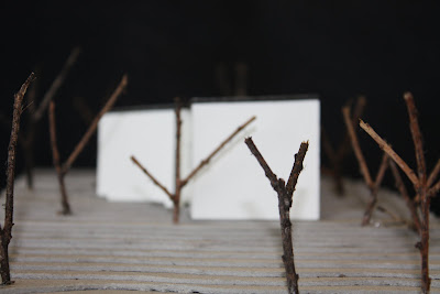 I used little twigs for my trees and white card for the actual house. I chose to use white card, as it both emphasises the house, and also can appear as negative space, allowing more focus to be on the site (as this is more of a site model) .
